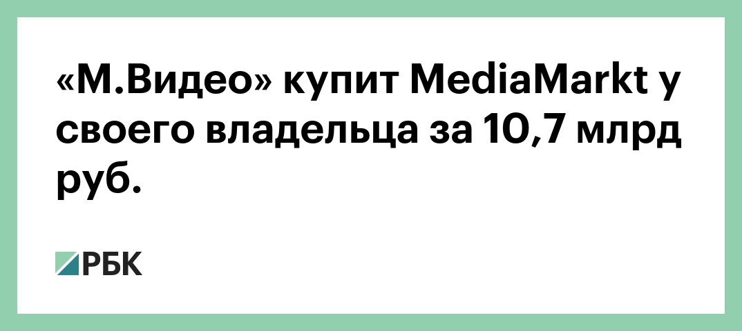 Крупнейший ретейлер бытовой техники и электроники в России «М.Видео» купит российское подразделение MediaMarkt у собственного владельца — группы «Сафмар». Об этом во время конференц-колла для инвесторов рассказал президент «М.Видео» Александр Тынкован. По его словам, сделка обойдется в 10,7 млрд руб., или €134 млн. Она будет финансироваться из собственных средств и банковского кредита, добавил он.