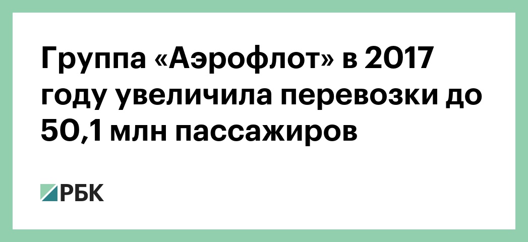 Группа «Аэрофлот» в январе—декабре 2017 года перевезла 50,13 млн пассажиров, что на 15,4% больше, чем в 2016-м, говорится в сообщении компании, опубликованном на ее сайте. Процент занятости пассажирских кресел в самолетах группы увеличился на 1,4 процентных пункта, до 82,2%.