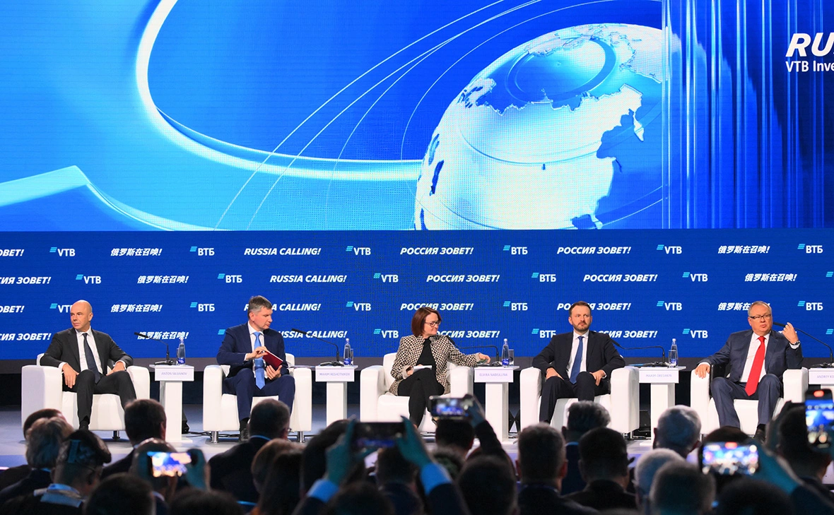 Антон Силуанов, Максим Решетников, Эльвира Набиуллина, Максим Орешкин и Андрей Костин на форуме ВТБ «Россия зовет!» в Москве