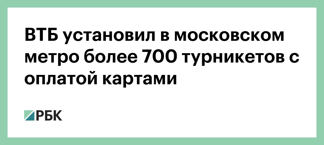 Банк ВТБ оснастил как минимум два турникета на каждой станции московского метро оборудованием для оплаты проезда банковскими картами, рассказал РБК вице-президент, руководитель департамента эквайринга ВТБ Алексей Киричек. Сейчас в подземке, по его словам, установлено 710 таких турникетов на 224 станциях метро, на некоторых станциях действует по три турникета, а на некоторых (с двумя входами) — по четыре.