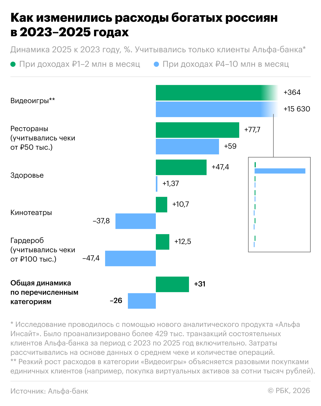 Так, траты на видеоигры богатые россияне с доходом от 1 млн до 2 млн руб. нарастили на 364% (по сравнению с 2023 годом). Среди тех, у кого доход составляет от 4 млн до 10 млн руб., рост составил и вовсе 15360%. Также выросли траты на рестораны — на 77,7%, а на здоровье — на 47,4%.
