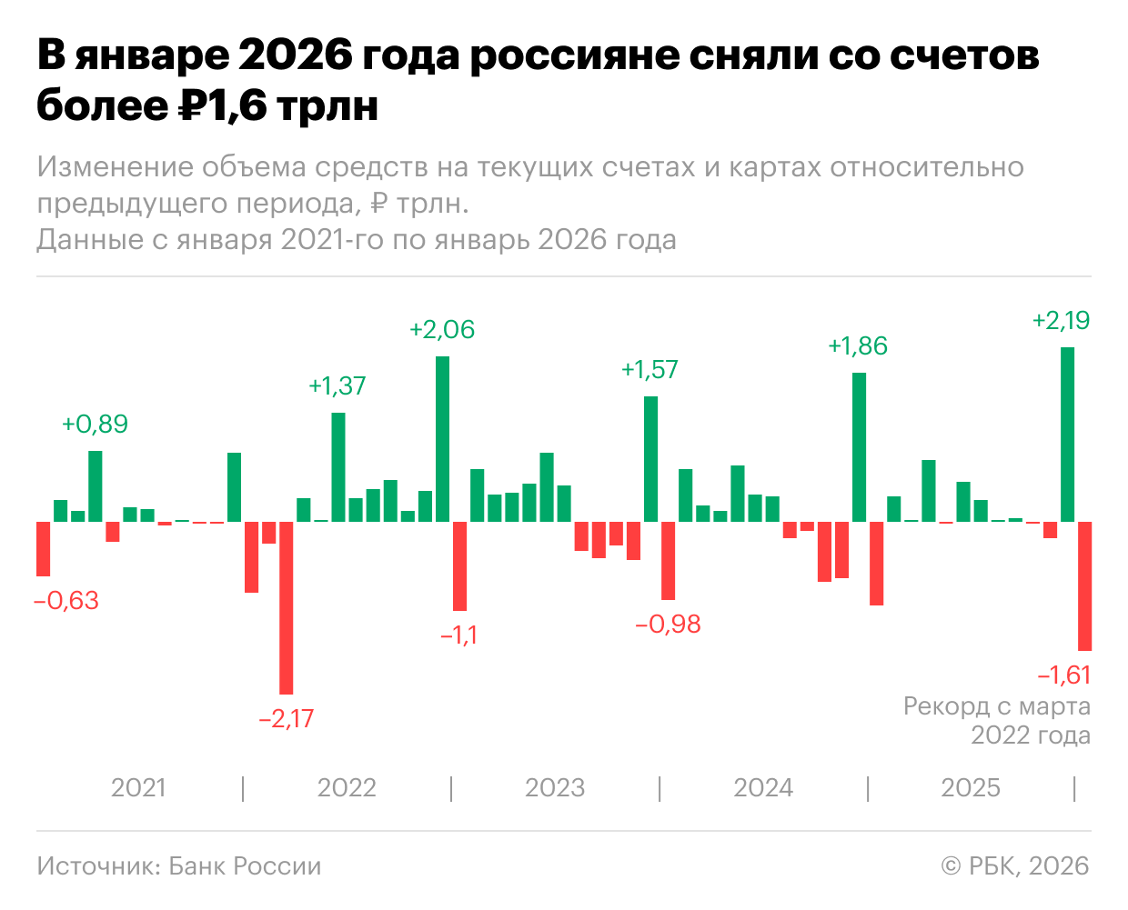 При этом в январе 2026 года они поставили рекорд по обналичиванию и сняли 1,6 трлн руб. Перед этим на счетах у них был декабрьский приток в 3,6 трлн руб., когда россияне получают премии и тринадцатые зарплаты.