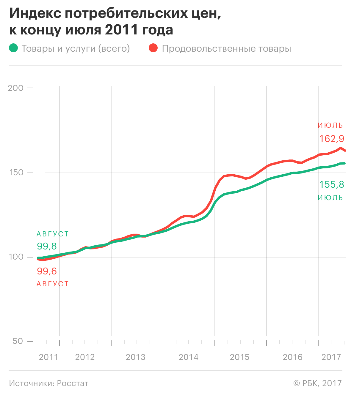 Произошли и другие изменения: с 2015 года начались поставки дешевых овощей в Россию из Ирана после снятия с него части санкций. Запрет на томаты из Турции освободил рынок для более дорогих зимних российских томатов и т.д. Однако при всей совокупности разнонаправленных факторов цены на продовольствие стали расти быстрее по сравнению с ценами на всю продукцию (промышленную и продовольственную).