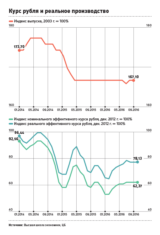 В целом же феномен летних подъемов 2015 и 2016 годов, особенно выраженный в обрабатывающей промышленности, может быть связан с другим циклом — ослаблением рубля в начале и его укреплением в середине года (в свою очередь, этот цикл, понятное дело, связан с динамикой цен на нефть). В мае 2015 года курс рубля по сравнению с январем—февралем укрепился на 23%, в 2016-м укрепление с февраля по июль составило 17%. В обоих случаях с некоторым лагом начиналось улучшение ситуации в производстве.