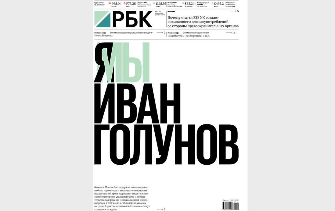 Иван Голунов был задержан в июне 2019 года по подозрению в хранении и сбыте наркотиков. Полицейские утверждали, что нашли у него наркотические вещества при личном обыске и в квартире. Журналист заявил, что наркотики ему подкинули, а преследование связывал с расследованиями, которые он тогда проводил. Задержание вызвало большой резонанс. У здания ГУ МВД по Москве на Петровке, 38 прошла многочасовая серия одиночных пикетов. Три ведущих деловых издания — РБК, «Ведомости» и «Коммерсантъ» — выступили с совместным заявлением и выпустили газетные номера с одинаковым слоганом на первой полосе: «Я/Мы Иван Голунов».