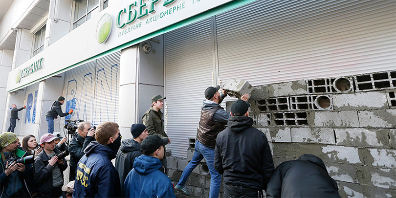 Возведение стены у входа в Сбербанк в Киеве. Фоторепортаж
