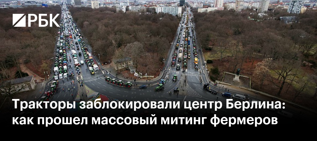 Немецкие фермеры организовали крупную акцию протеста в Берлине — они заблокировали улицы правительственного квартала тракторами и погрузчиками. В город прибыло более 5 тыс. единиц техники, что затруднило движение транспорта. Аграрии выступают против планов властей по сокращению субсидий и отмене налоговых льгот для сельхозпроизводителей. Обстановка в Берлине — в фоторепортаже РБК.
