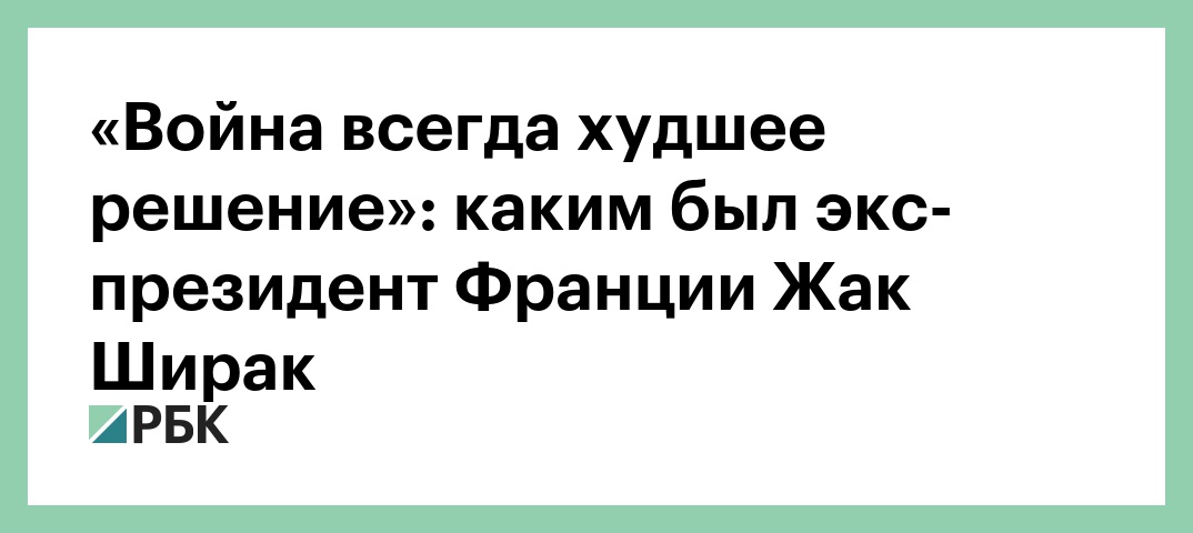 Общество26 сентября 2019, 14:43«Война всегда худшее решение»: каким был экс-президент Франции Жак ШиракВходит в сюжетыВ этой статьеReutersAPReutersReutersFrancois Mori / APReutersRemy Dela Mauviniere / APAPReutersReutersReutersReutersРБК в MAXНа связи с проверенными новостямиЧитайте РБК в MAХ! Самые важные новости, только проверенная информация. Зеленский рассказал о требовании США уйти из Донбасса ради гарантий МВД предложило сделать платным доступ банков к базам полиции Иран разрешил России и еще четырем странам проход по Ормузскому проливу WSJ узнала, что США убрали из целей двух чиновников Ирана для переговоров Bloomberg: США изучают, какие последствия будут у скачка цен на нефть до $200 На Чукотке проведут серию аукционов на месторождения россыпного золота АвторыТегиЮлия СапроноваАнастасия АнтиповамультимедиаФранцияЖак Ширак