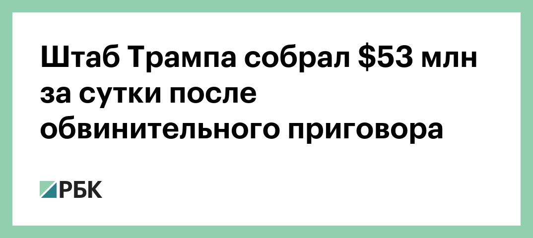 За несколько первых часов после вынесения приговора республиканец собрал $35 млн, позднее сумма увеличилась до $52,8 млн, отчитались в штабе. «Этот импульс только начинается», — говорится в совместном заявлении Сьюзи Уайлс и Крис ЛаЧивита — двух главных советников Трампа.