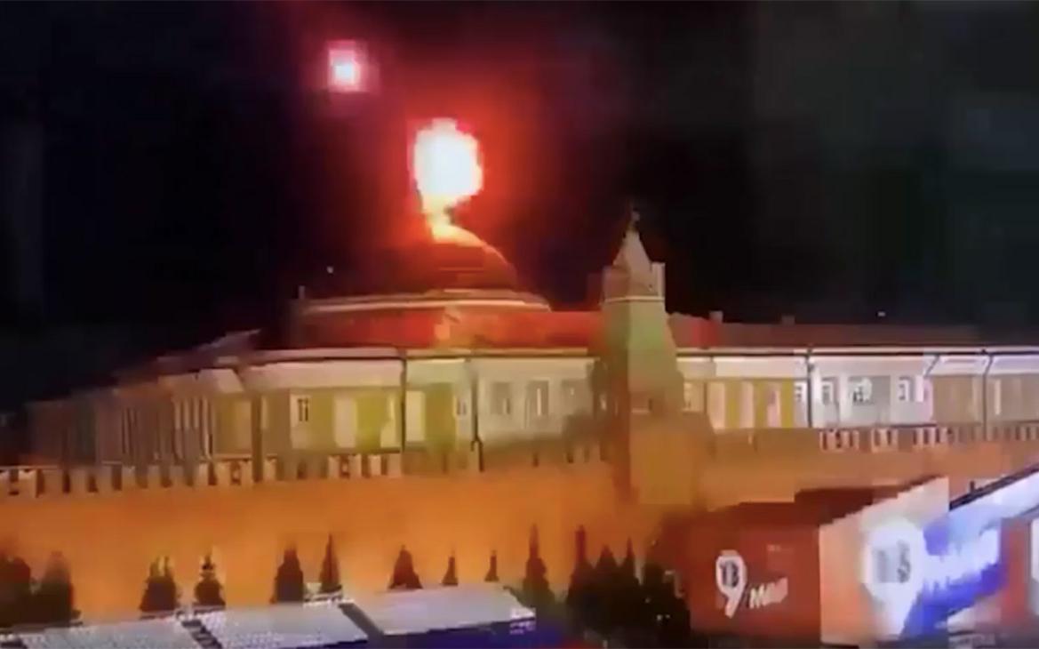 В Сети появилось видео, на котором, предположительно, виден момент атаки беспилотника на Кремль. Его опубликовал, в частности, телеведущий Владимир Соловьев. На кадрах, снятых со стороны ГУМа, видно, как во флагшток на здание в Кремле летит беспилотник. Потом раздается взрыв.