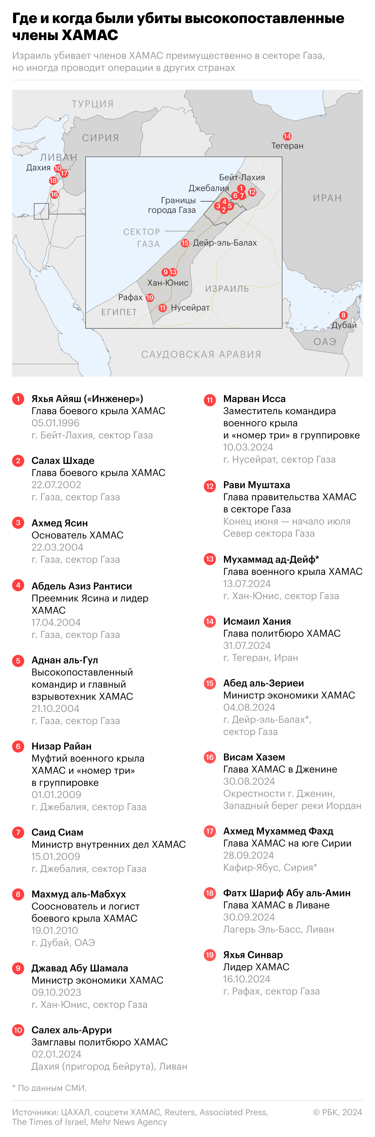 17 октября израильская армия сообщила, что ликвидировала лидера ХАМАС Яхью Синвара, охоту за которым вела более года. Убийства каких еще руководителей группировки приписывают Израилю — в инфографике РБК