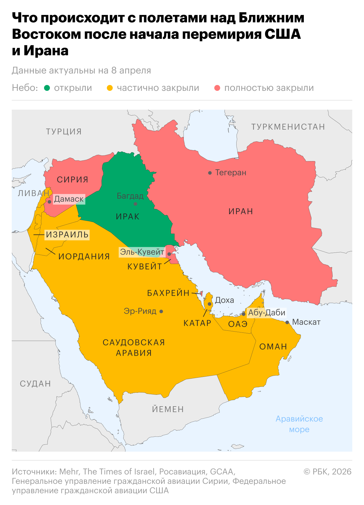 Ирак открыл воздушное пространство после объявления перемирия США и Ирана. Где небо остается полностью или частично закрытым — на карте РБК