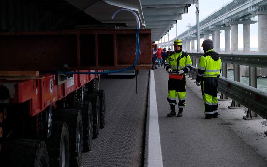 Крымский мост был поврежден при взрыве 8 октября, частично обрушилось два автомобильных пролета. Накануне первый готовый пролет доставили к месту ремонта, а 8 ноября его установка завершилась. Монтаж второго начнется 11 ноября
