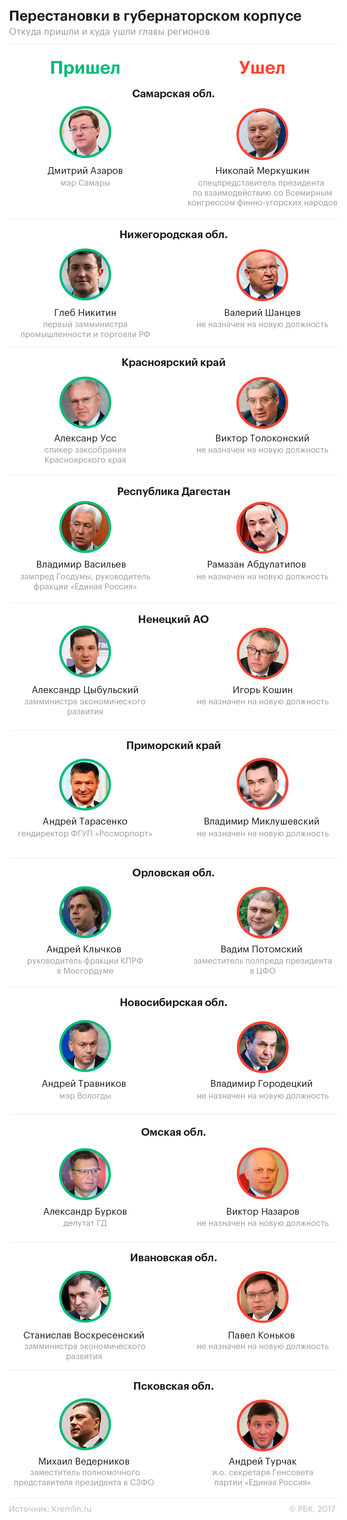 12 октября Владимир Путин назначил главой Псковской области замполпреда президента в СЗФО Михаила Ведерникова вместо Андрея Турчака. Ранее источники РБК в Кремле рассказывали об отставке примерно десяти глав регионов в рамках курса на ротацию губернаторского корпуса. 11 октября источник РБК в Кремле сообщил, что последним отставленным губернатором в рамках этого этапа ротации регионального руководства станет Андрей Турчак.