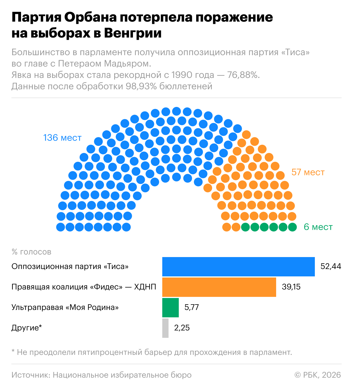 Партия «Тиса» завоевала конституционное большинство в парламенте Венгрии по итогам выборов. По результатам подсчета 98,93% бюллетеней у нее 136 мест в парламенте.