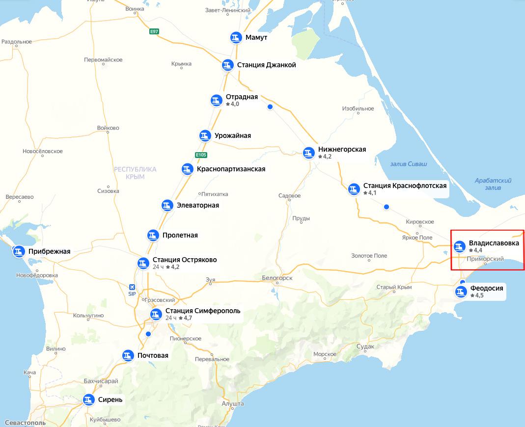 Станция Владиславовка находится на востоке Крыма и входит в состав участка железной дороги Джанкой — Феодосия. Прямого железнодорожного сообщения от Владиславовки до Симферополя нет: сначала поезда следуют на север до Джанкоя и лишь затем направляются на юг к Симферополю.