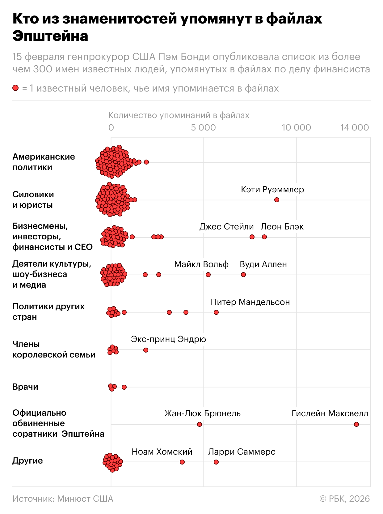 Генпрокурор США Пэм Бонди обнародовала список более чем 300 имен, фигурирующих в файлах по делу Джеффри Эпштейна. Кто упомянут в архиве — в инфографике РБК