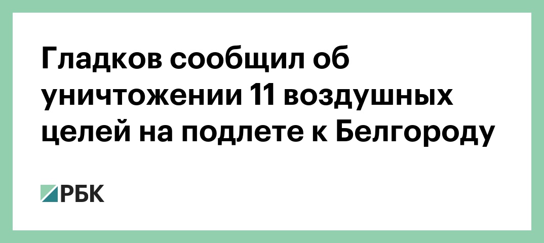 Тревога ракетной опасности в регионе была объявлена в 22:09 мск. Гладков отчитался о сбитии 11 воздушных целей на подлете к Белгороду. Предварительно, никто не пострадал