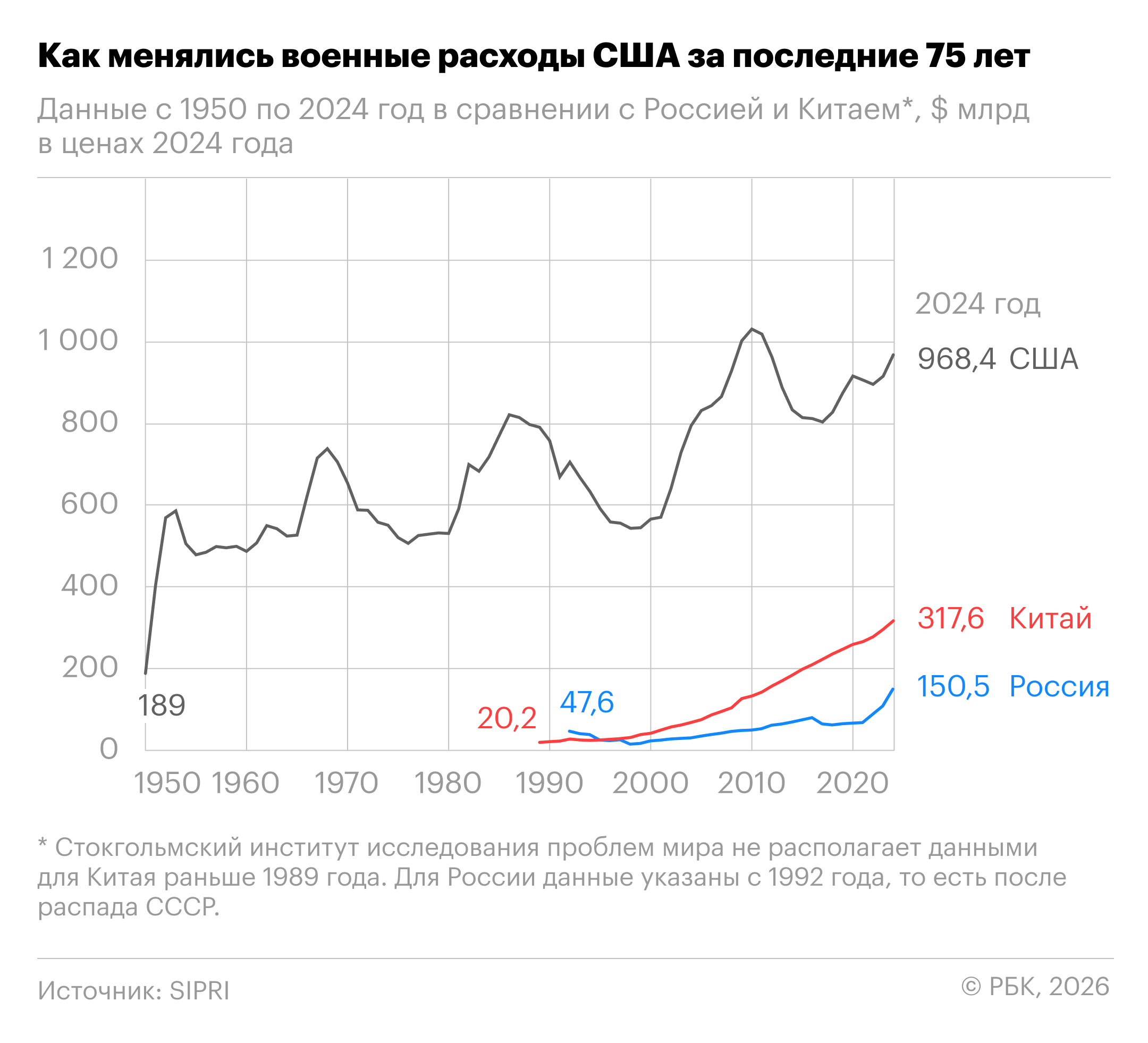 Общий объем военных расходов США в 2024 году достиг $968,4 млрд, подсчитали в Стокгольмском институте исследования проблем мира (SIPRI). Для сравнения: расходы Китая за тот же период составили $317,6 млрд, то есть в три раза меньше, России — $150,5 млрд, меньше почти в шесть с половиной раз.
