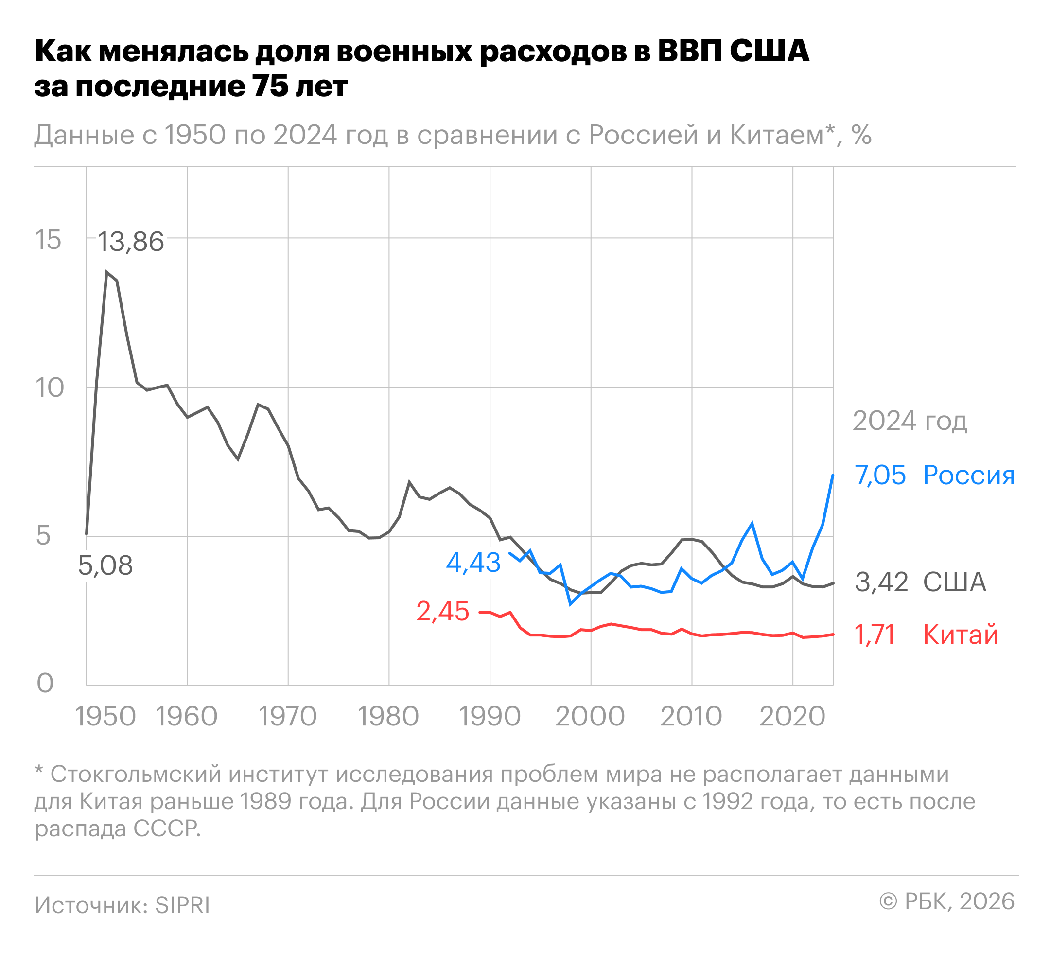 При этом доля военных расходов в ВВП США с годами снижается. Максимума за последние 75 лет она достигла в 1952 году, во время Корейской войны, когда составила почти 14%. В 2014 году доля упала ниже 4% и с тех пор не превышала этот показатель.