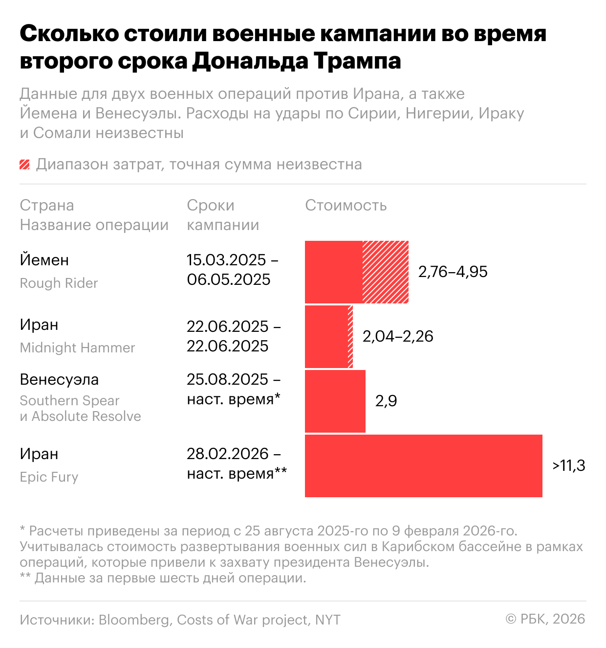 Операция «Полуночный молот» (Midnight Hammer), в рамках которой 22 июня 2026 года военные США нанесли удары по ядерным объектам Ирана, стоила от $2,04 млрд до $2,26 млрд, подсчитали в проекте Университета Брауна Costs of War. Расходы на кампанию «Грубый наездник» (Rough Rider), в рамках которой США наносили удары по хуситам в Йемене с 15 марта по 6 мая 2025 года, по данным проекта, составляли от $2,76 млрд до $4,95 млрд.