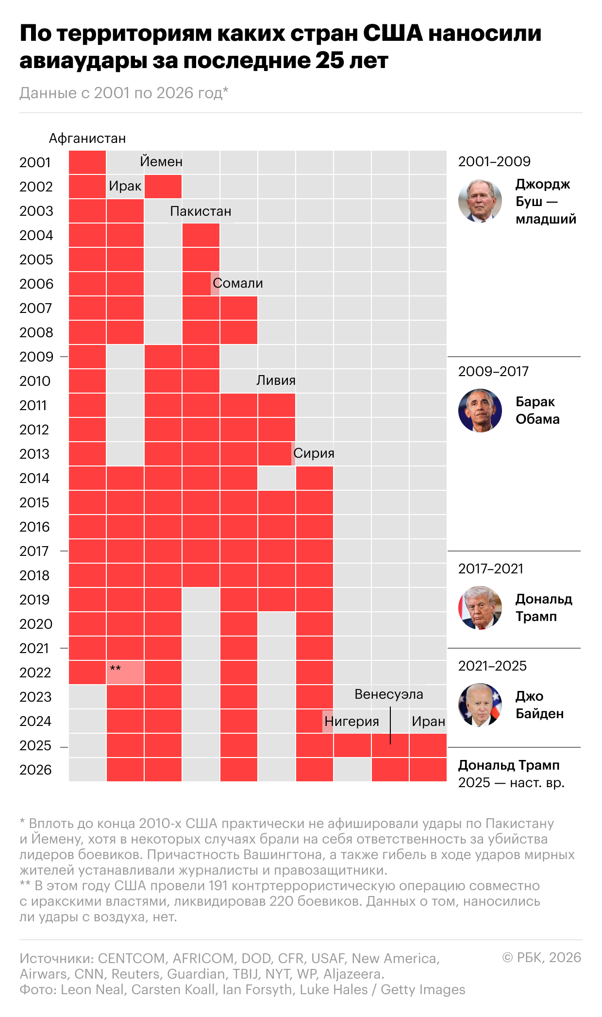 За последние 25 лет США многократно задействовали ракеты и беспилотники как в ходе полномасштабных войн, так и в рамках точечных операций против террористических группировок и прокси-формирований. Основными театрами действий стали Афганистан, Ирак, Йемен, Пакистан, Сомали, Ливия и Сирия. С возвращением Дональда Трампа в Белый дом этот список пополнили Иран и Венесуэла.