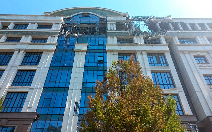 Здание находится по адресу: бульвар Пушкина, 7Б. Как пишет Донецкое агентство новостей, снаряды попали в фасад, также пострадали правое крыло и верхний этаж, после чего начался пожар.