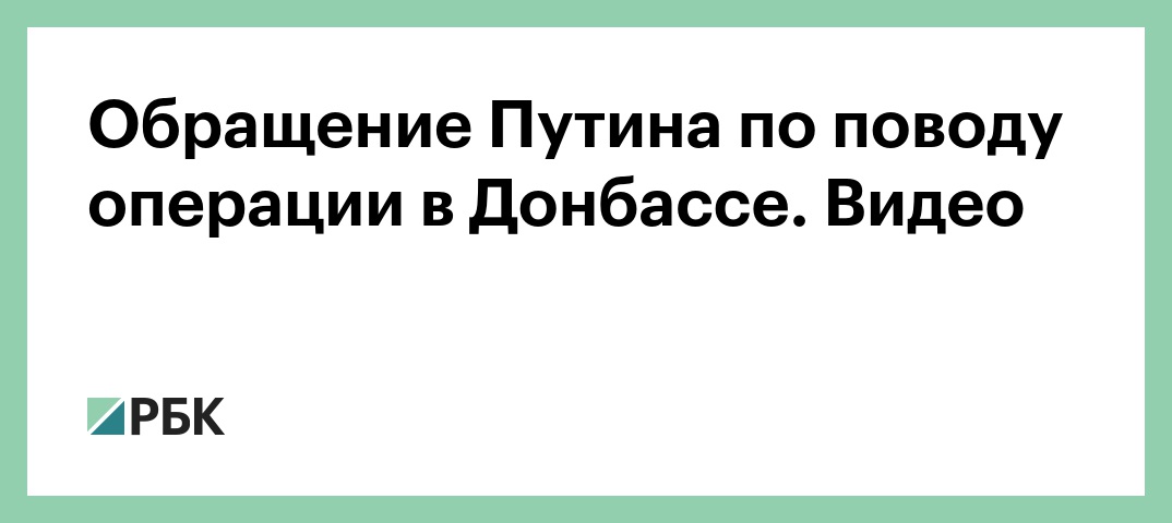 Военная операция на Украине24 февраля 2022, 06:25Обращение Путина по поводу операции в Донбассе. ВидеоВладимир Путин объявил о проведении специальной военной операции в ДонбассеВходит в сюжетВоенная операция на УкраинеВ этой статьеРБК в MAXНа связи с проверенными новостямиЧитайте РБК в MAХ! Самые важные новости, только проверенная информация. Зеленский рассказал о требовании США уйти из Донбасса ради гарантий МВД предложило сделать платным доступ банков к базам полиции Иран разрешил России и еще четырем странам проход по Ормузскому проливу WSJ узнала, что США убрали из целей двух чиновников Ирана для переговоров Bloomberg: США изучают, какие последствия будут у скачка цен на нефть до $200 На Чукотке проведут серию аукционов на месторождения россыпного золота ТегиВладимир ПутинДонбассОперация