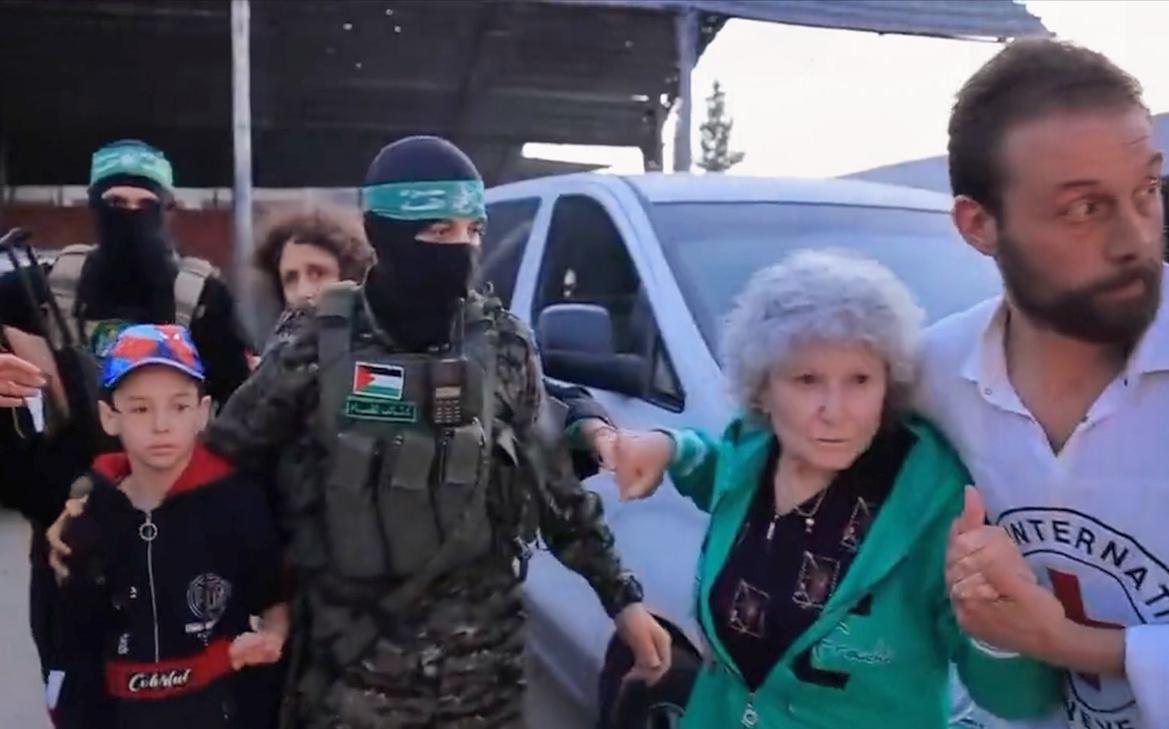 Момент освобождения израильской заложницы вооружённым крылом ХАМАС «Бригады Аль-Кассам» в неизвестном месте в секторе Газа