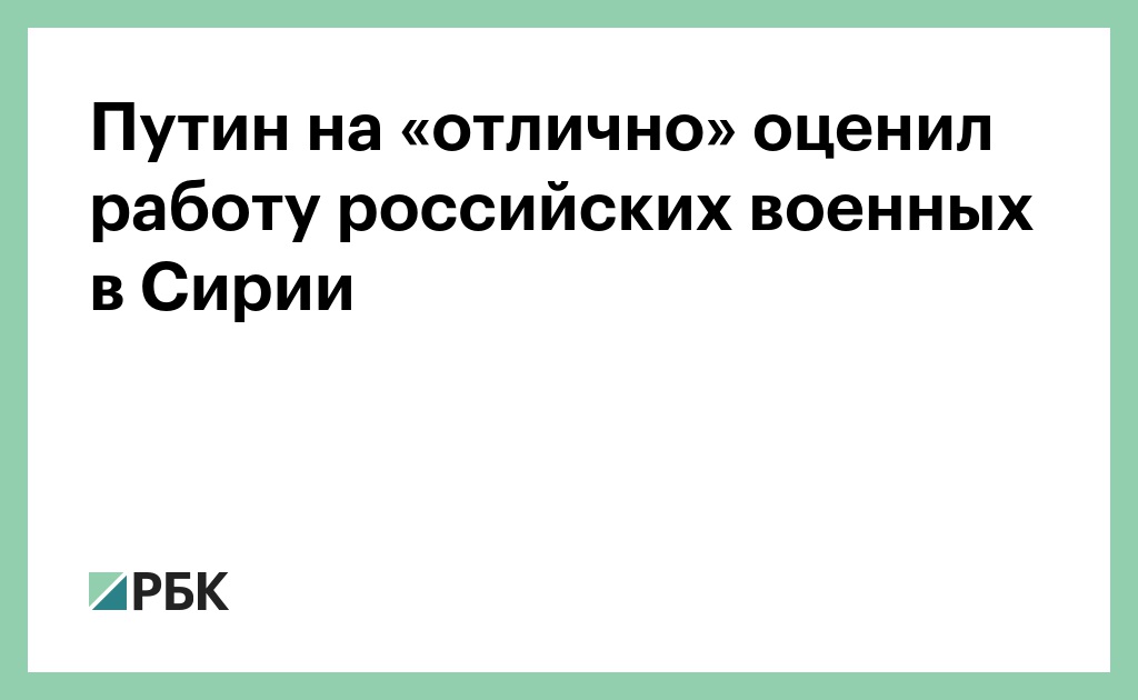 «Оценка действий наших армии и флота может быть только одна — отлично», — сказал он. По его словам, российские военные в борьбе с терроризмом действовали «мужественно, профессионально и эффективно». Путин отметил, что российские военные продемонстрировали «возросшие современные возможности» вооруженных сил страны и внесли «решающий вклад в разгром наиболее боеспособной группировки международных террористов».