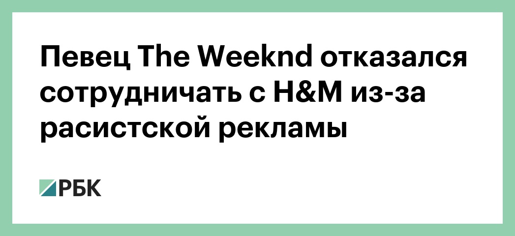 Певец опубликовал рекламную фотографию детской коллекции бренда, на которой заснят темнокожий мальчик в толстовке с надписью «Самая крутая обезьяна в джунглях». The Weeknd написал, что был «шокирован и расстроен» снимком. «Я глубоко оскорблен и не буду больше работать с H&M», — заявил исполнитель.