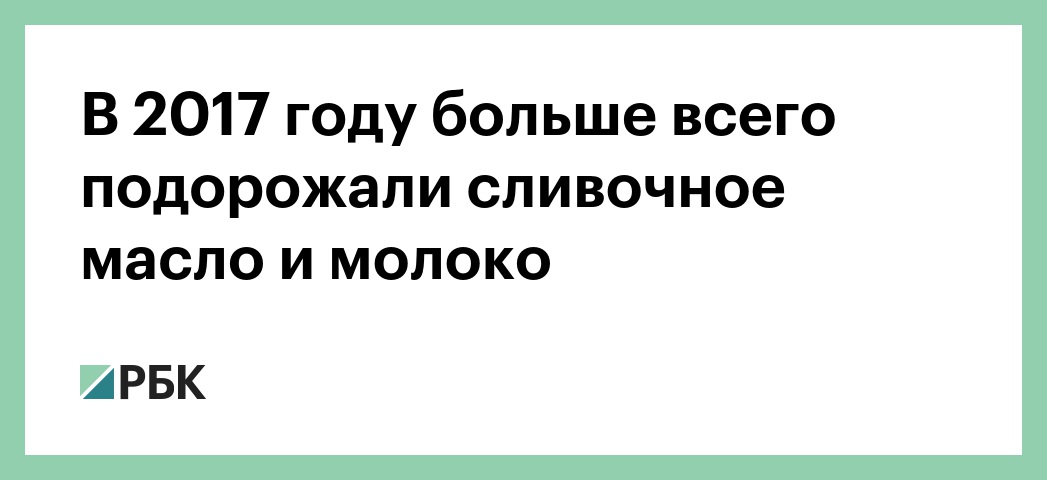 В 2017 году потребительские цены на сливочное масло выросли по сравнению с предыдущим годом на 20,6% (Росстат приводит только динамику, не уточняя абсолютные значения). Молоко и молочная продукция подорожали на 8,5%. Среди других продуктов, которые заметно подорожали за прошлый год, — рыба и морепродукты (+4,3%), хлеб и хлебобулочные изделия (+4%). Незначительно изменились цены на макароны (+1,7%), мясо и птицу (+0,8%). В целом цены на продовольствие выросли в 2017 году на 3%, на алкоголь — на 4,5%.