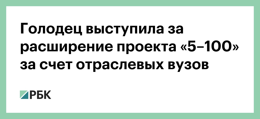 Вице-премьер Ольга Голодец предложила расширить проект по повышению конкурентоспособности ведущих российских вузов «5–100» за счет отраслевых вузов. Об этом она рассказала в интервью РБК на Российском инвестиционном форуме в Сочи.
