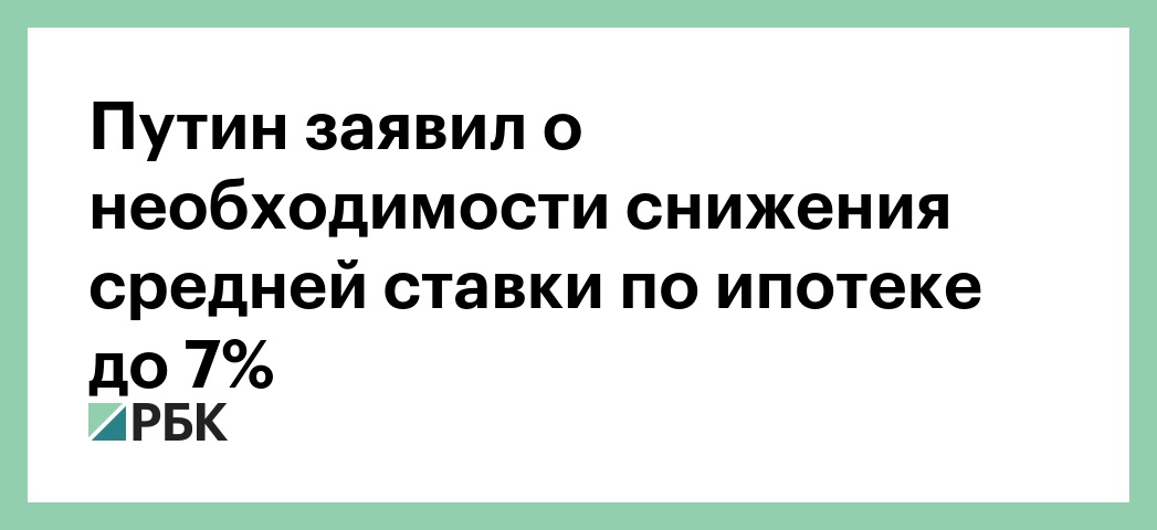 Президент России Владимир Путин, обращаясь с посланием к Федеральному собранию, заявил, что необходимо снизить среднюю ставка ипотечного кредитования в России до 7%, передает корреспондент РБК.