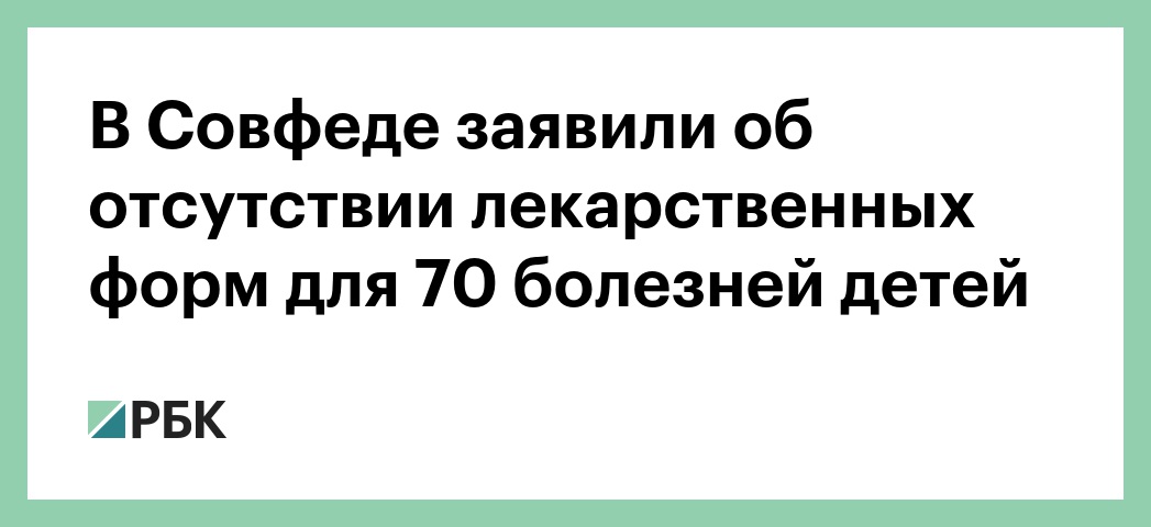 На сегодняшний день более чем для 70 заболеваний педиатрического профиля не существует лекарственных форм, сообщила сенатор Татьяна Кусайко на заседании рабочей группы Совета Федерации по вопросам законодательного регулирования применения лекарственных средств в педиатрии. На заседании обсуждались предложения по законодательному регулированию вопросов применения лекарственных средств в педиатрии, передает корреспондент РБК.