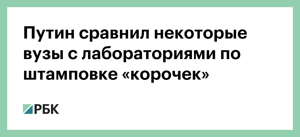 «Проблема в том, что начиная примерно с 1991 по 2010 год у нас количество вузов и их филиалов выросло ровно в два раза, и значительная часть из них, надо признать, превратилась не в вузы, а в лаборатории по штамповке корочек», — заявил Путин. В последние годы, по его словам, количество высших учебных заведений сократилось на 30%, а их филиалов — более чем на 60%. «Это вызвано необходимостью закрывать эти конторы «Рога и копыта», которые ничего не дают, кроме бумажки», — пояснил российский лидер.