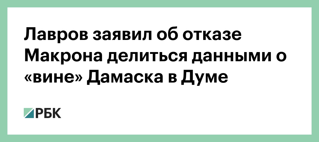 «Президент Франции [Эмманюэль] Макрон, публично заявивший о «неопровержимых фактах», подтверждающих применение химического оружия в сирийской Думе «режимом [президента Сирии Башара] Асада», разговаривал с президентом России Владимиром Путиным», — сказал Лавров. Телефонная беседа лидеров обеих стран состоялась 13 апреля.