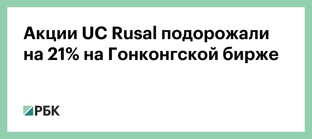 Акции UC Rusal дорожали на 21,13% в ходе торгов в Гонконге, до 1,72 гонконгского доллара. Об этом свидетельствуют данные биржи. На момент открытия биржи цена за одну акцию UC Rusal составляла 1,46 гонконгского доллара, а во время предыдущего закрытия — 1,42.