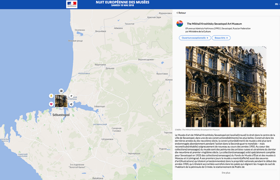 Речь идет о карте музеев, которые примут участие в акции «Ночь музеев — 2018». Одним из музеев стал Севастопольский художественный музей имени М.П. Крошицкого. В подписи к нему на карте было указано, что он находится по адресу: «проспект Нахимова, 9, Севастополь, Российская Федерация». Однако затем информация на сайте Министерства культуры обновилась. Сейчас на сайте ведомства указано: Sevastopol, Ukraine.