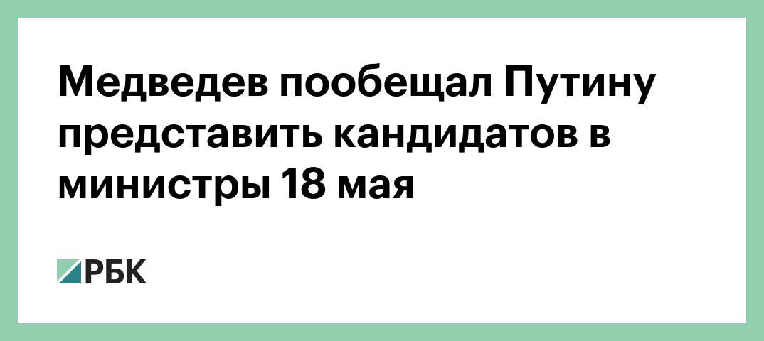Кандидаты на должности новых министров будут представлены в пятницу, 18 мая, заявил премьер-министр Дмитрий Медведев во время встречи с президентом Владимиром Путиным, трансляцию которой вел телеканал «Россия 24».