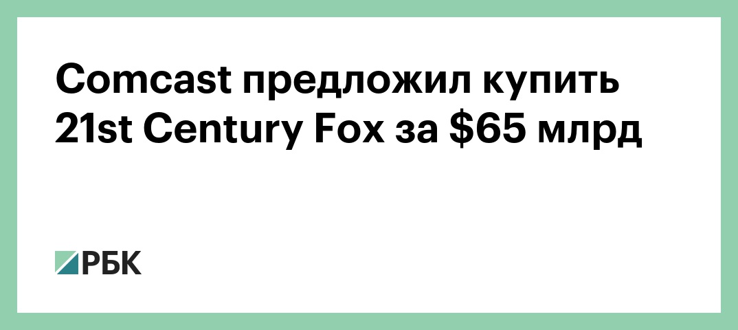 Американский телекоммуникационный конгломерат Comcast предложил купить 21st Century Fox, которую собирается купить The Walt Disney Company, за $65 млрд, сообщается на сайте конгломерата.