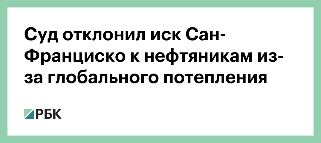 В Калифорнии федеральный суд отклонил иск городов Сан-Франциско и Окленд к пяти крупнейшим мировым нефтекомпаниям, говорится в сообщении американской нефтедобывающей компании Chevron. Власти городов требовали от нефтяников создания специального фонда, который бы компенсировал ущерб от изменения климата.