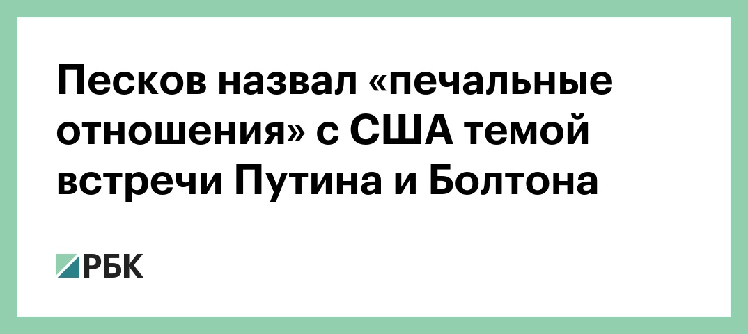 Пресс-секретарь президента России Дмитрий Песков назвал обсуждение «печальных отношений» между странами темой встречи Владимира Путина с советником американского лидера по национальной безопасности Джоном Болтоном, сообщает корреспондент РБК.