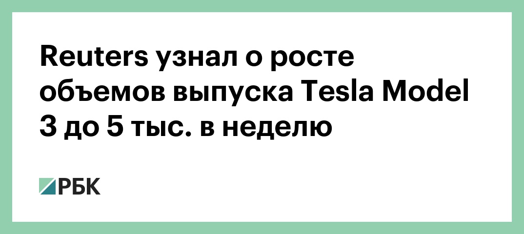 Основанная Илоном Маском компания-автопроизводитель Tesla увеличила объемы выпуска автомобилей Tesla Model 3 до 5 тыс. единиц в неделю, сообщает Reuters со ссылкой на двух неназванных рабочих фабрики в Калифорнии.