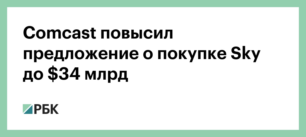 Американский телекоммуникационный конгломерат Comcast повысил предложение о покупке британской компании Sky (владеет телеканалом Sky News) до $34 млрд, сообщается на сайте Comcast.