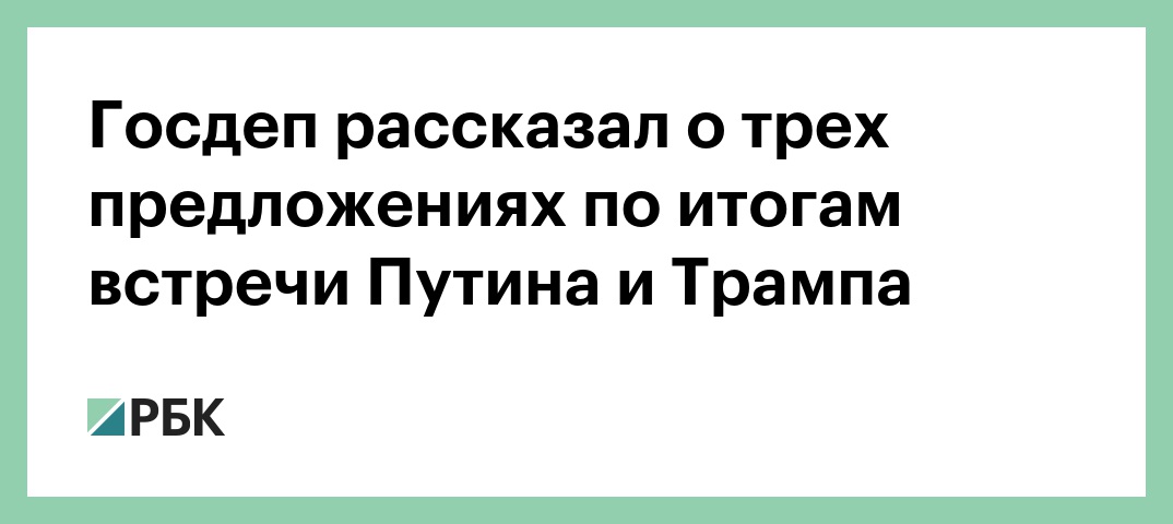 Госдепартамент рассматривает три предложения по итогам встречи главы США Дональда Трампа с президентом России Владимиром Путиным. Они касаются контактов бизнесменов, политологов и военных, сообщила официальный представитель ведомства Хизер Нойерт на брифинге, стенограмма которого опубликована на сайте Госдепа.
