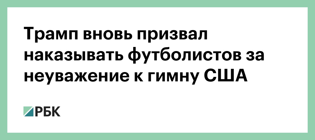 «Дискуссии о национальном гимне во время игр NFL продолжаются — не могу в это поверить! Разве в соглашении не указано, что игроки должны стоять, положив руку на сердце? Комиссионер NFL должен выразить свою позицию [по этому вопросу]», — написал Трамп. Он предложил дисквалифицировать на одну игру футболистов, встающих на одно колено при исполнении национального гимна, при повторном нарушении игрока следует отстранить от матчей на сезон или лишить зарплаты.