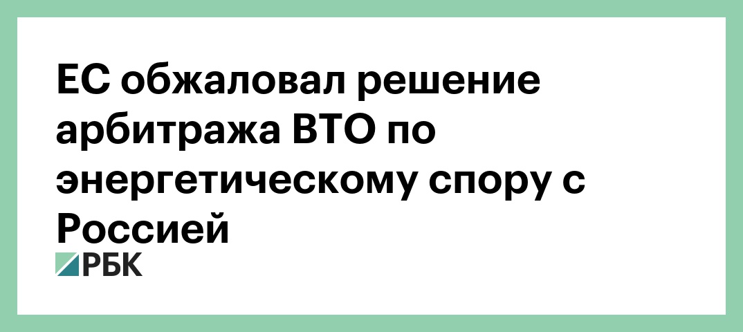 «ЕС направил 21 сентября апелляцию, касающуюся доклада группы арбитров ВТО по вопросу, представленному Россией: «Европейский союз и его члены — некоторые меры, касающиеся энергетического сектора», — указывается в сообщении. Отмечается, что доклад группы был распространен среди членов ВТО еще 10 августа.
