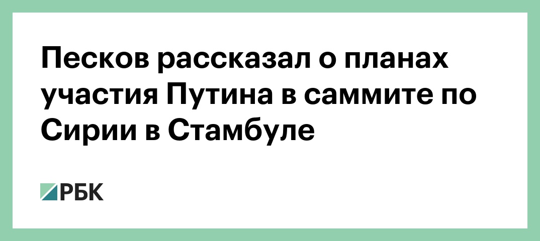 Президент России Владимир Путин примет участие в четырехстороннем саммите на высшем уровне по урегулированию ситуации в Сирии. Мероприятие пройдет в Стамбуле, заявил пресс-секретарь главы государства Дмитрий Песков. Об этом сообщает корреспондент РБК.