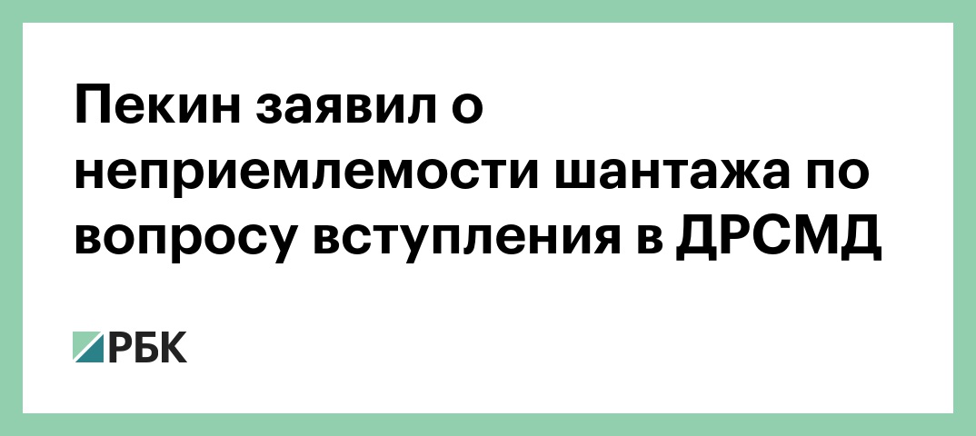 Официальный представитель МИД Китая Хуа Чуньин, в ходе брифинга комментируя заявление США о том, что КНР должен присоединится к договору о ликвидации ракет средней и малой дальности (ДРСМД) заявила, что Пекин не потерпит шантажа. Об этом сообщается на сайте китайского внешнеполитического ведомства.
